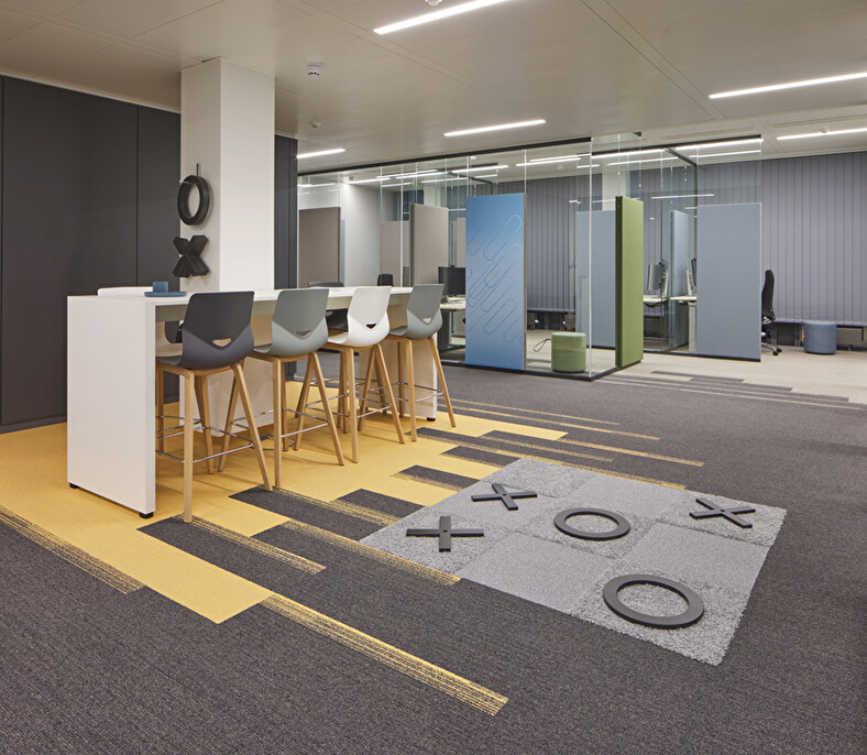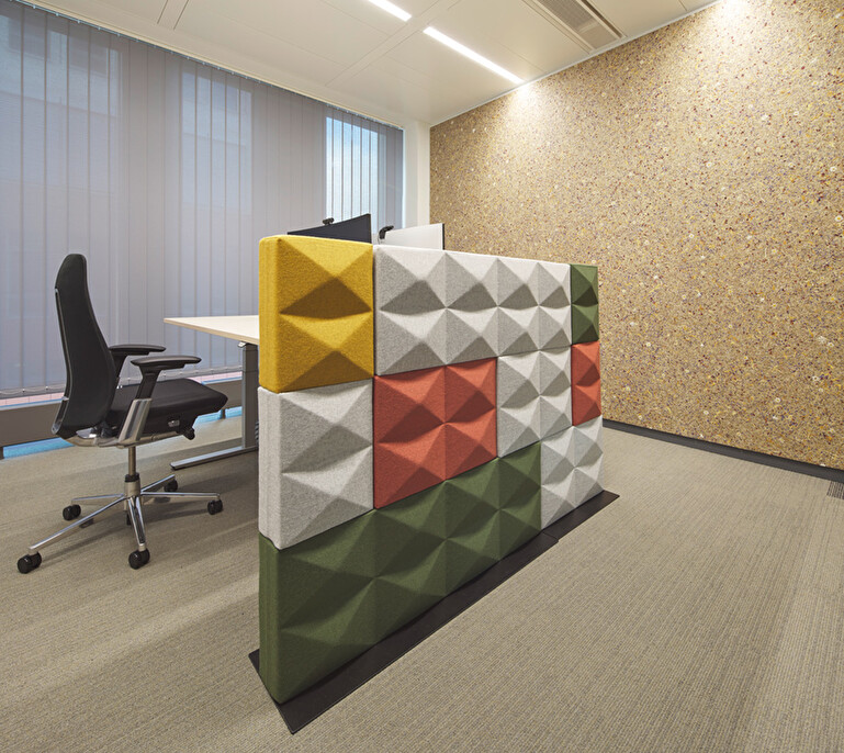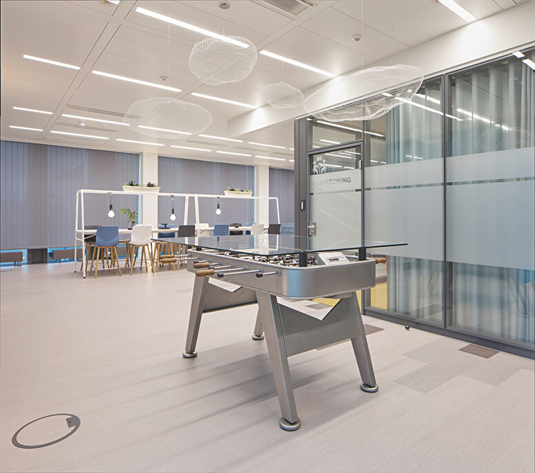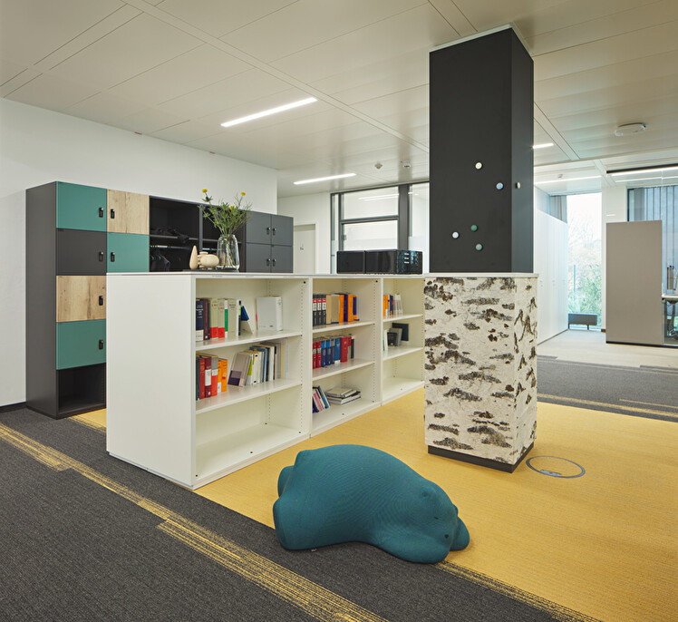 Um das Bürogebäude effizient zu nutzen, wurde ein Buchungssystem eingeführt, um feste Arbeitsplätze abzulösen. Mittels einer Quote, die den tatsächlichen Bedarf an Arbeitsplätzen abdeckt, konnten die sonst ungenutzten Arbeitsflächen für die entwickelten Raummodule sinnvoll genutzt werden. Projektspezifische Arbeitsprozesse lassen sich Dank der Einführung von Desksharing und mobilem Mobiliar einfach im Büroalltag umsetzen.
