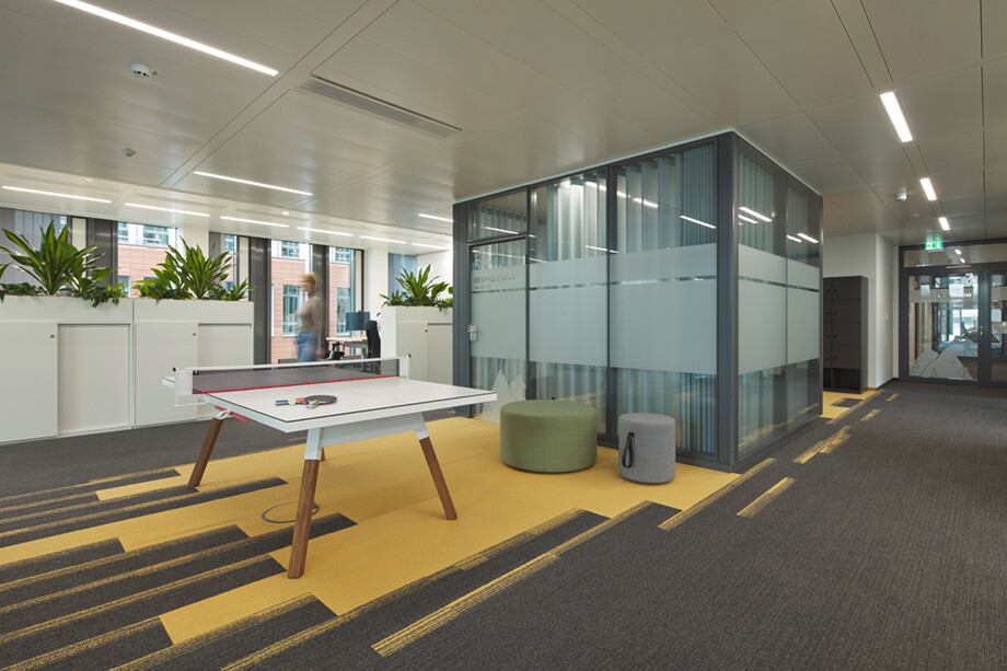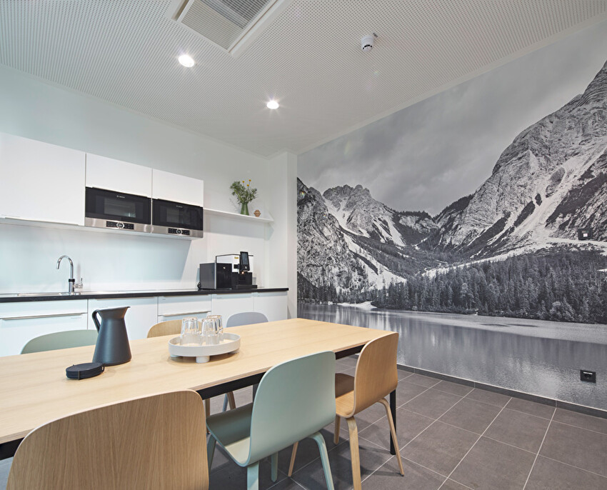 Kommunikationsfördernde Aufenthaltsbereiche, wie z.B. die Teeküchen oder aktiv nutzbare Mittelzonen im Zentrum der Büroflächen, dienen dem Allgemeinwohl der Mitarbeiter:innen und bieten alternative Austauschflächen gegenüber dem klassischen Büro an.