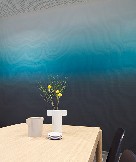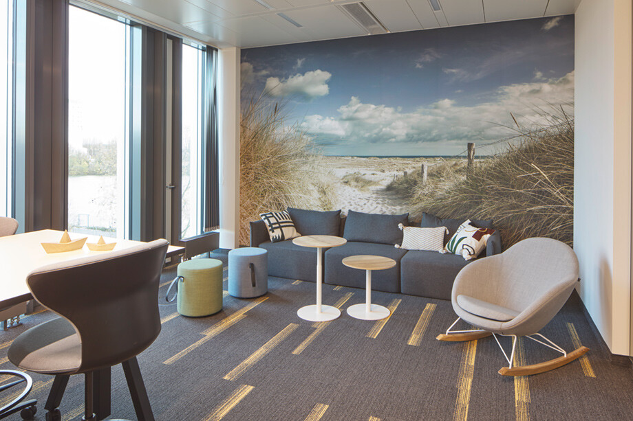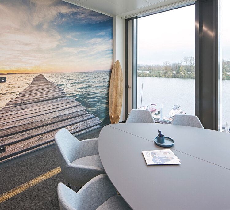 In den Geschossen wurden mittels Themenwelten Wiedererkennungsmerkmale gesetzt und so das Gesamtgebäude abwechslungsreich gestaltet. Bewusst ist mit den Themenwelten die Natur im Innenraum integriert worden, um das angeborene Bedürfnis, sich mit der Natur zu verbinden, zu unterstützen und so für Wohlbefinden zu sorgen. Gerade auch dadurch, dass der Neubau in einer wunderbaren Naturlandschaft am Schiersteiner Hafen in Wiesbaden gelegen ist und somit eine hohe Aufenthalts- und Gestaltungsqualität und ein kreatives Arbeitsumfeld gefördert wird.