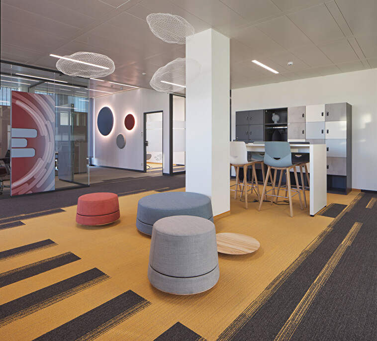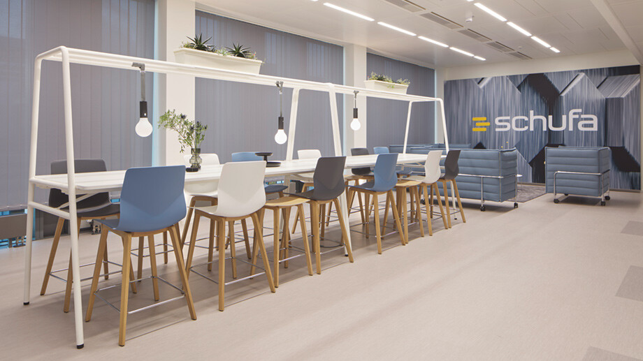 Das ganzheitlich entwickelte Raumkonzept bietet modernste Arbeitsräume, welche jegliche Art des Arbeitens unterstützen, so die Motivation steigern und die SCHUFA Holding AG zu einem attraktiven Arbeitgeber macht.