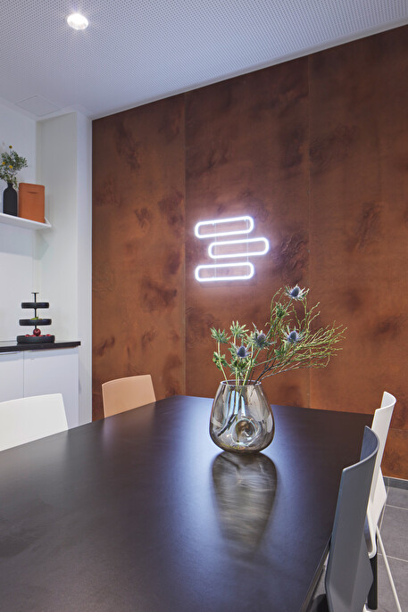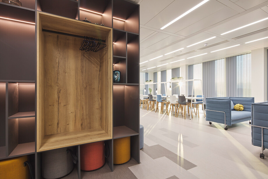 In Zusammenarbeit mit der SCHUFA Holding AG und bei gemeinsamen Workshops mit den Mitarbeitenden wurden insgesamt fünf Raummodule entwickelt, die der Maßgabe einer neuen Arbeitswelt gerecht werden und ein ideales Arbeitsumfeld für verschiedenste Anforderungen abbildet. Ziel war es, die Unternehmenskultur in die Innenarchitektur zu übersetzen und diese so für die Mitarbeitenden sichtbar und spürbar zu machen.